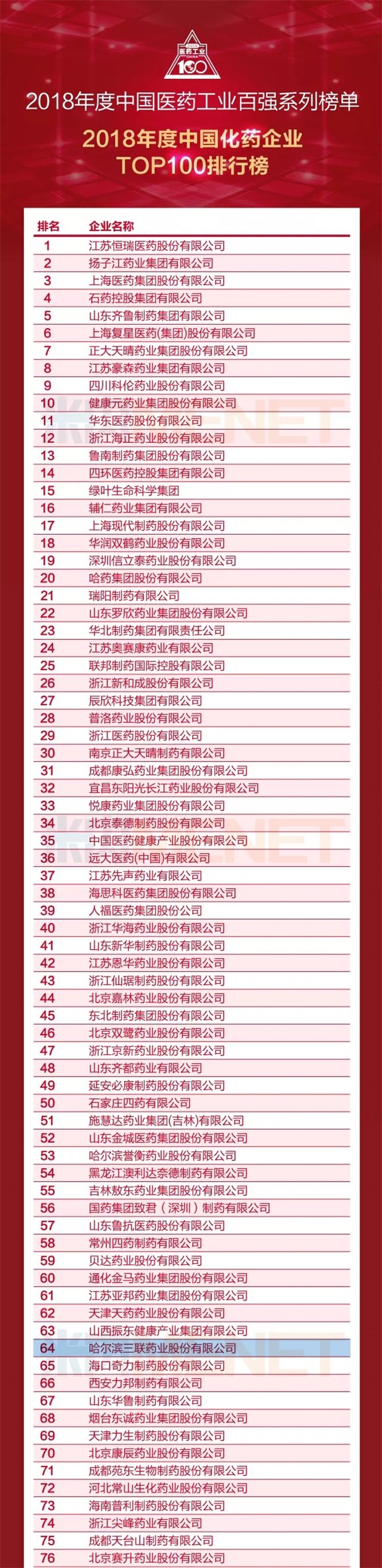 7月15日,在山東濟(jì)南舉行的2019全國藥店周暨中國醫(yī)藥創(chuàng)新發(fā)展大會上,米內(nèi)網(wǎng)、醫(yī)藥經(jīng)濟(jì)報聯(lián)合發(fā)布了“2018年度中國醫(yī)藥工業(yè)百強(qiáng)系列榜單”,分為“2018年中國化藥企業(yè)TOP100”等5大子榜單,哈爾濱三聯(lián)藥業(yè)股份有限公司位列中國化藥企業(yè)TOP100排行榜第64位。