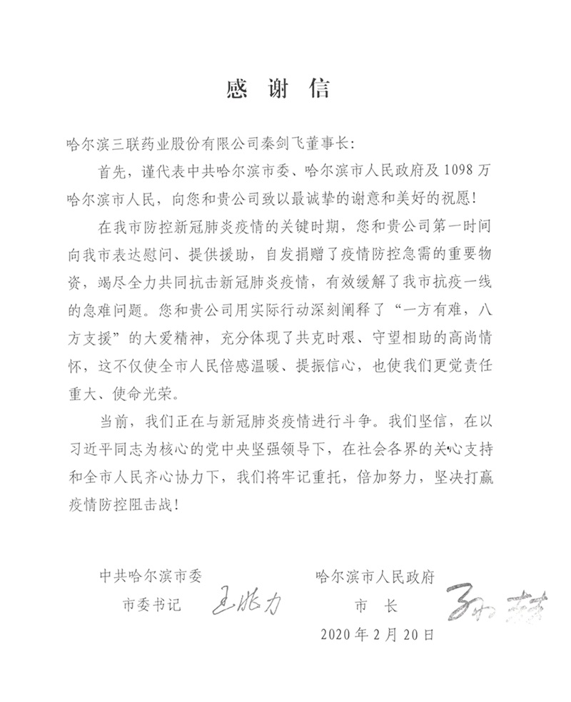 一方有難,八方支援,在舉國上下共同抗擊疫情時期,哈三聯時刻關注疫情發展以及抗疫一線的物資需求,積極籌措物資馳援一線,希望能為抗擊疫情盡一份綿薄之力。今天,就在中國傳統節日“二月二,龍抬頭”的前一天,我們有幸收到了一封來自哈爾濱市委書記王兆力、市長孫喆的感謝信:
