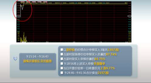 以 2015 年 3 月 23 日為例,相關賬戶利用資金優勢,制造出股價開盤上漲的走勢,吸引其他投資者跟風買入,該股開盤后不久直接封上漲停板,違法主體卻悉數賣出了全部所持股票,瀟灑獲利離場。該日的股價走勢和操縱情況見下圖: