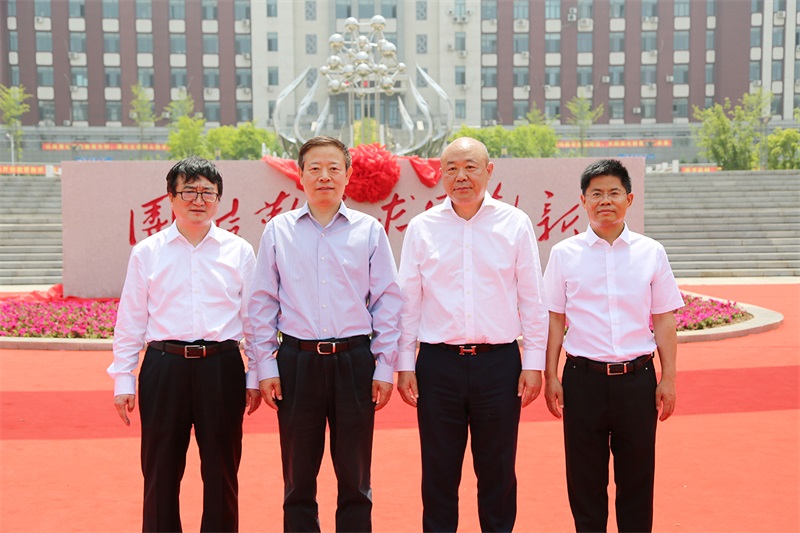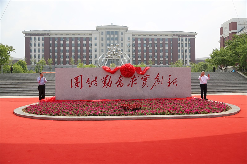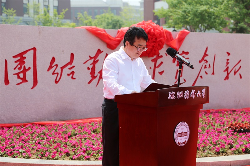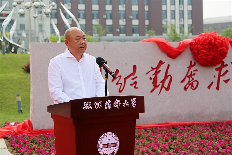 沈陽藥科大學校黨委書記徐鳳翔、哈三聯董事長兼總經理秦劍飛為校訓石揭幕