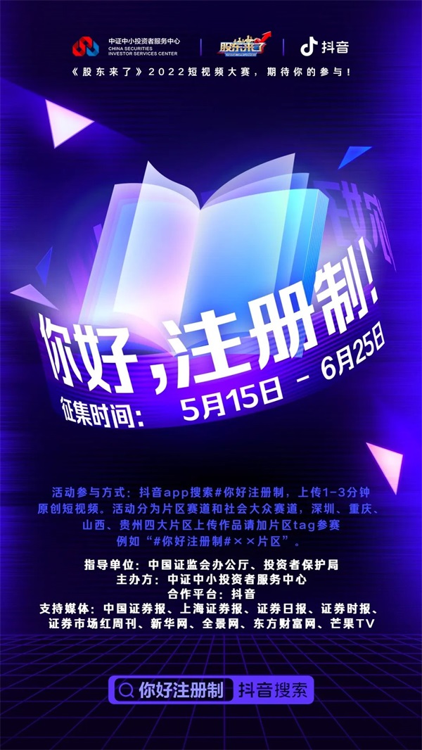 為進一步貫徹落實中國證監會黨委關于資本市場人民性的要求和保護投資者合法權益的職責,在證監會辦公廳、投資者保護局的指導下,中證中小投資者服務中心將于今年5月至9月舉辦《股東來了》2022投資者權益知識競賽活動。