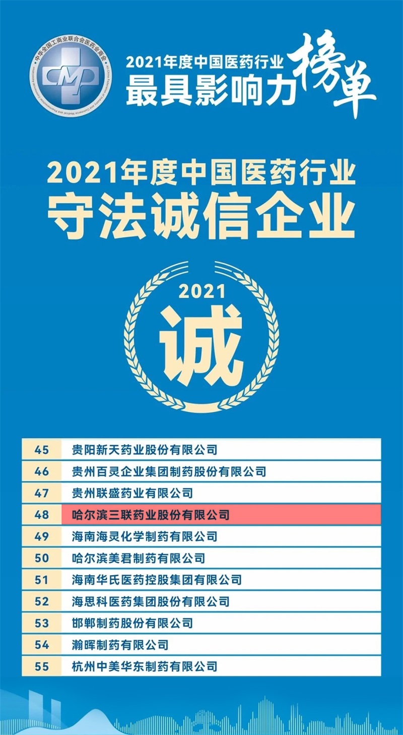 近日,全國工商聯醫藥業商會網絡發布2021年度中國醫藥行業最具影響力榜單,哈三聯喜獲年度中國醫藥行業守法誠信企業。