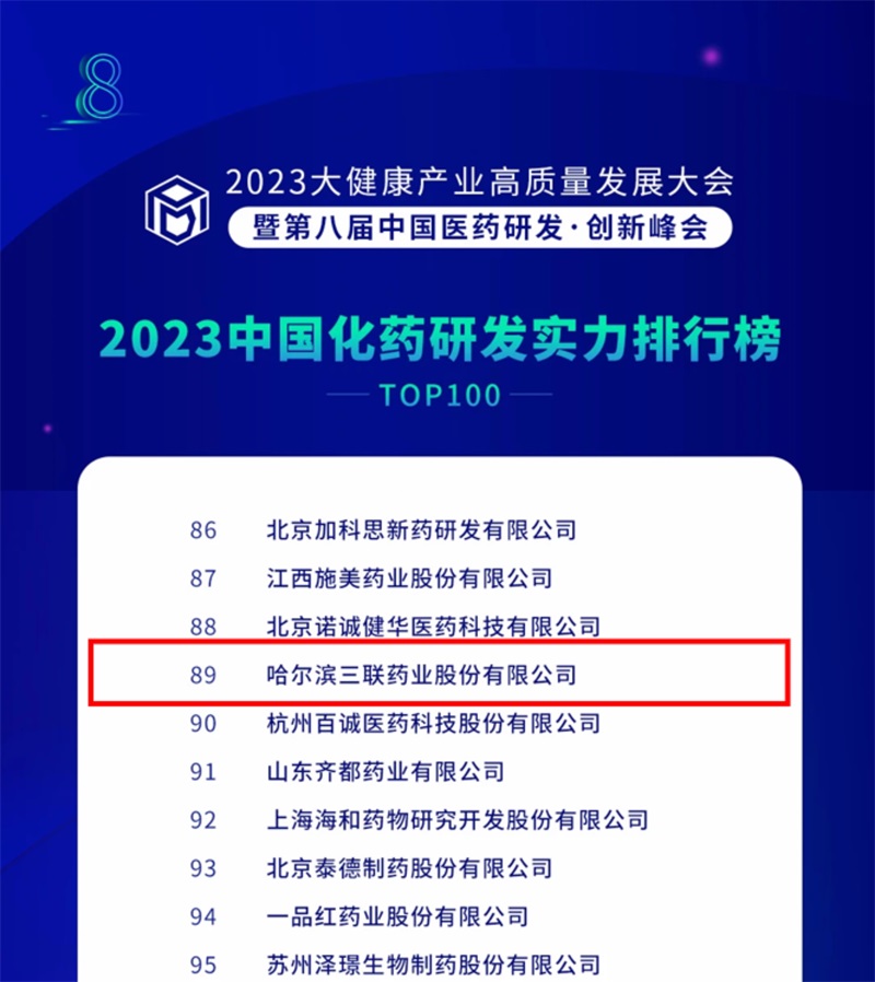 哈三聯躋身“2023中國化藥研發實力排行榜TOP100”榜單第89位