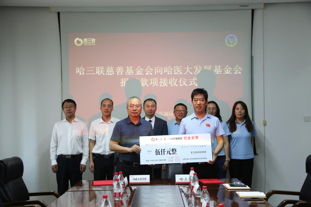 6月26日,哈三聯(lián)與哈爾濱醫(yī)科大學(xué)藥學(xué)院舉行實踐教學(xué)基地簽約揭牌儀式暨基金會捐贈儀式。哈爾濱醫(yī)科大學(xué)藥學(xué)院黨委書記孫建平,院長張勇,副院長梁海海、謝良軍,團委副書記王琦,藥化聯(lián)合黨支部書記甘春麗;哈三聯(lián)人力資源中心總監(jiān)吳大勇,黨群工作總監(jiān)、慈善基金會秘書長殷洪玉及相關(guān)部門負責(zé)人出席本次儀式。