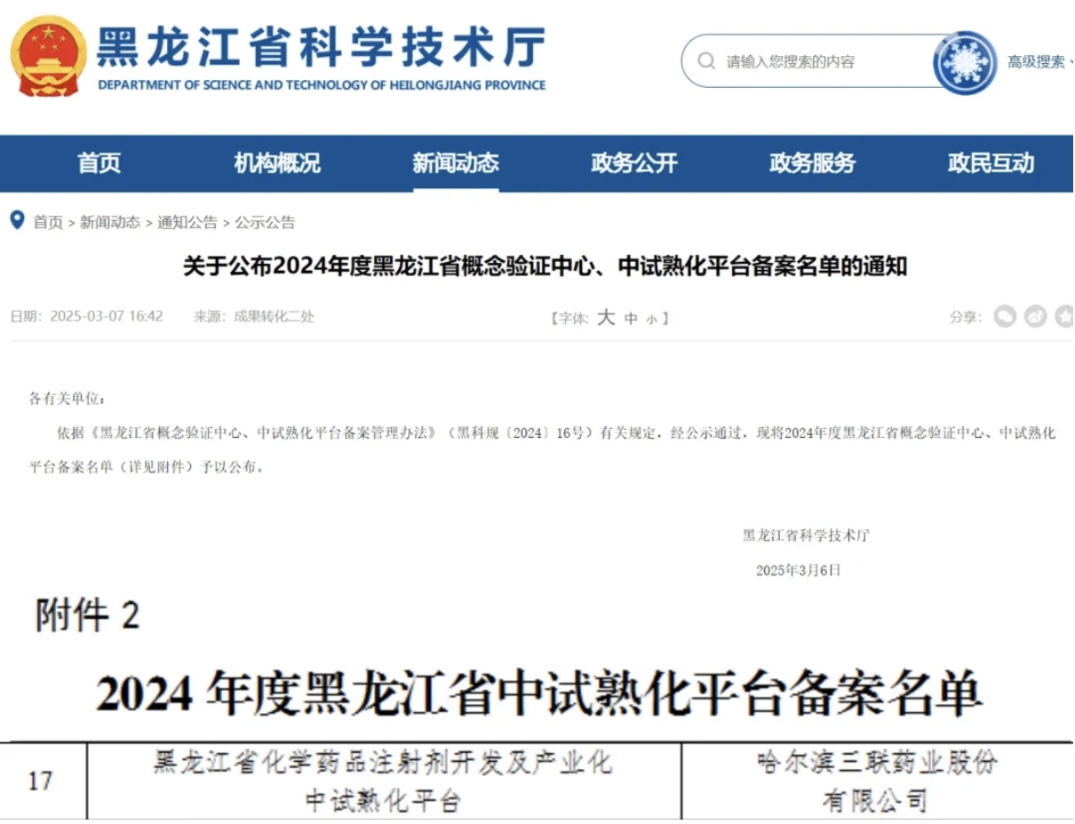 近日,黑龍江省科技廳公布《2024年度黑龍江省概念驗證中心、中試熟化平臺備案名單》,哈三聯作為黑龍江省化學藥品注射劑開發及產業化中試熟化平臺成功入選,成為省內首批中試熟化平臺。