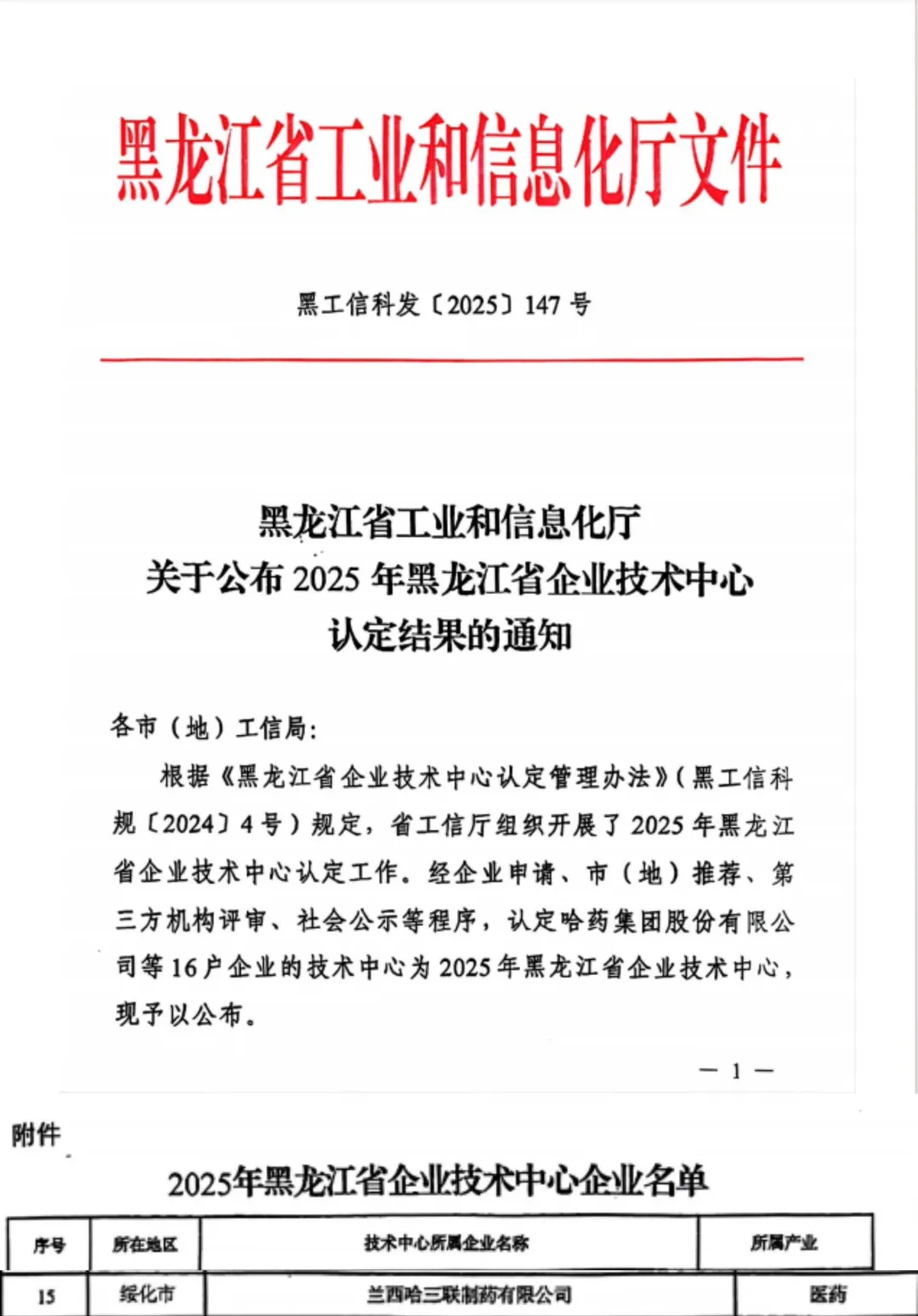 近日,黑龍江省工業和信息化廳公布2025年黑龍江省企業技術中心企業名單,哈三聯全資子公司蘭西哈三聯制藥成功入選。
